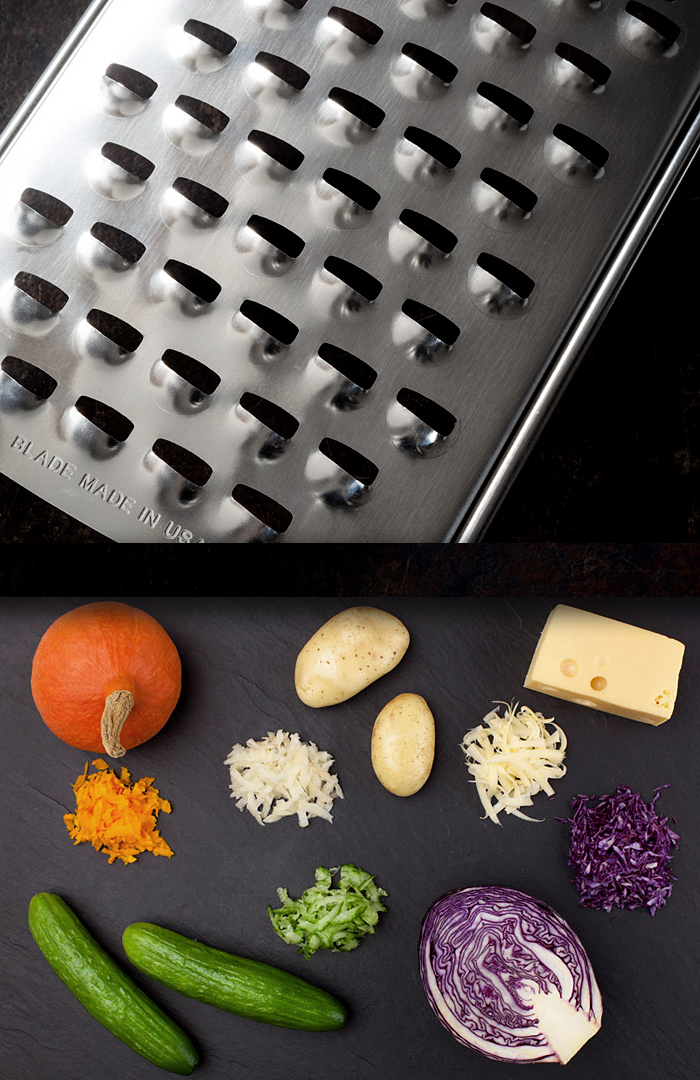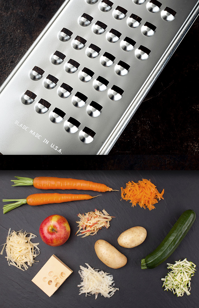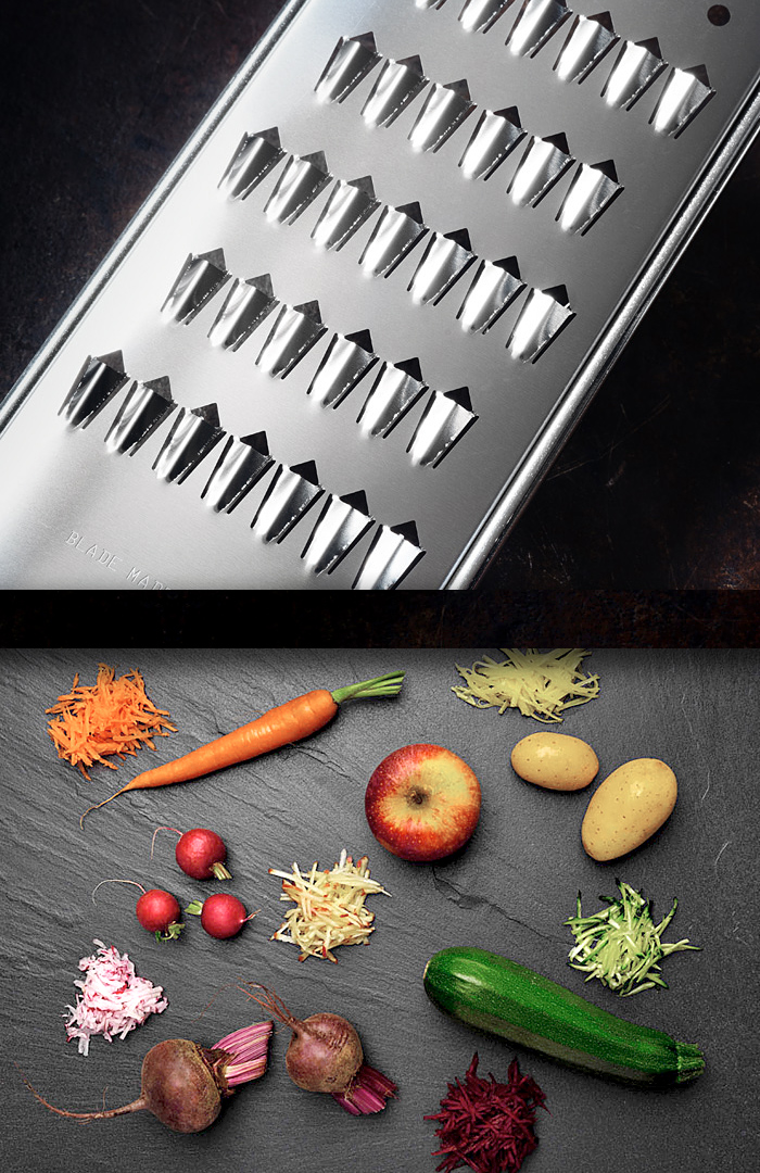 Ideal einsetzbar, um Hart- und Weichkäse zu reiben für Omeletts, Soufflés, Gratins und andere kulinarische Höhepunkte. Sowie für Zwiebeln und Kartoffeln um zum Beispiel Rösti zu kreieren. Die vielseitige Klinge bewältigt auch mühelos harte Lebensmittel wie Schokolade für zahlreiche Desserts und für Karotten oder Radieschen für vitaminreiche Salate.