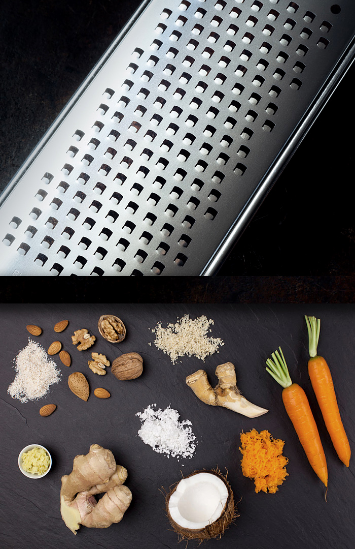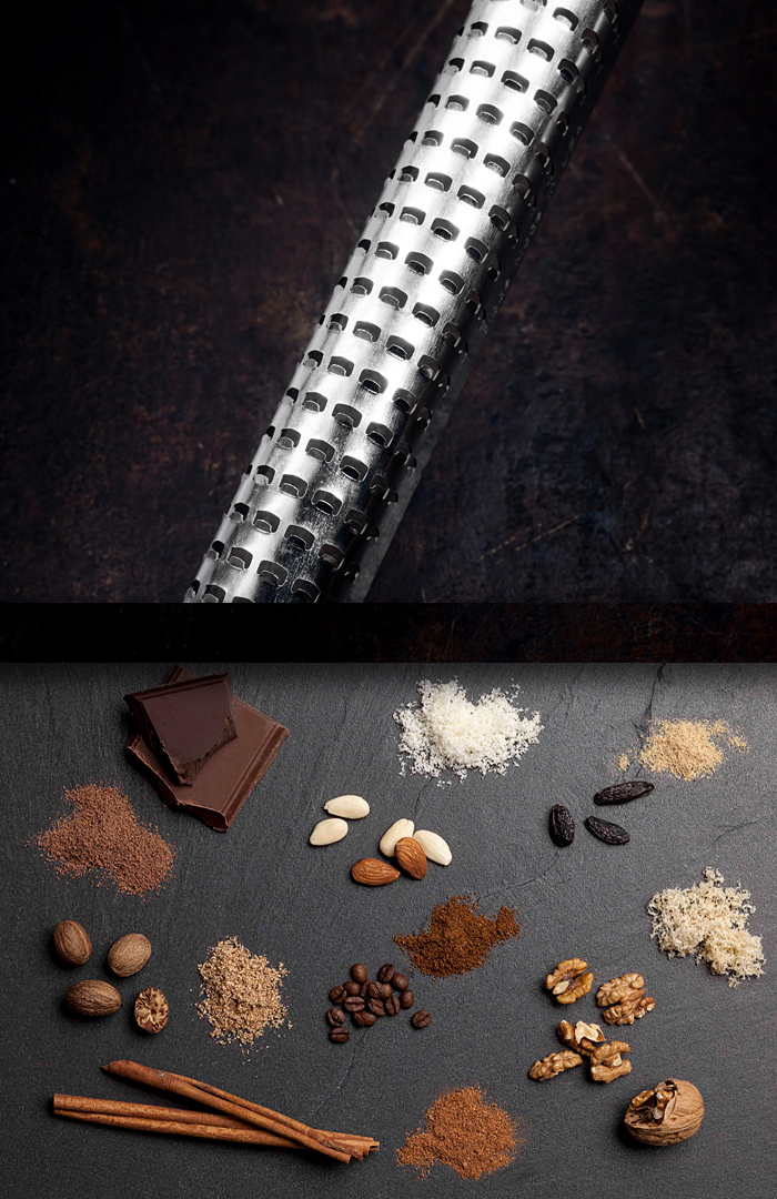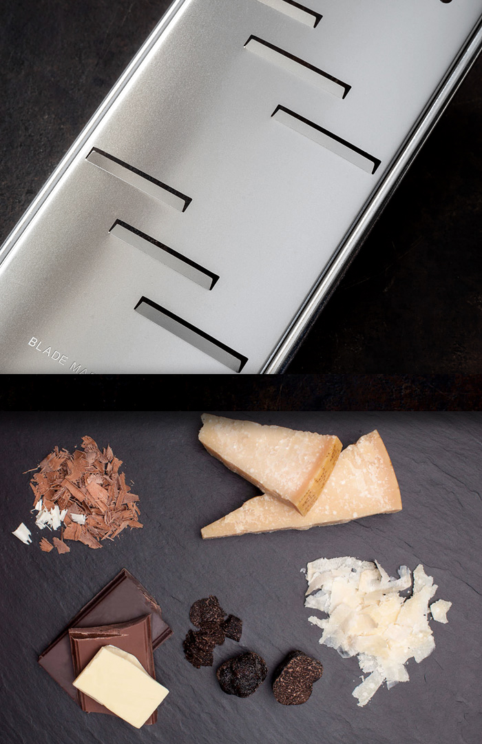 Die feine Klinge ist ideal für den Abrieb von Zitrusfrüchten, ohne an die Bitterstoffe zu gelangen. Zitrusschalenabrieb ist perfekt, um herzhafte Gerichte und Dressings im Geschmack zu erweitern und wunderbar als Backzutat. Die Klinge ist auch geeignet um harte Gewürze, wie Muskatnuss, Zimt, Tonkabohnen oder auch Schokolade zu reiben. Das Reibergebnis ist extra fein, und das entstandene Pulver kann als raffinierter Geschmacksverstärker und als kräftiges Aroma nahezu jedem Rezept hinzugefügt werden.
