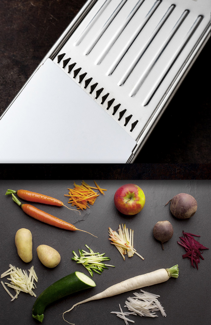 Mit der 2-Wege-Schneide kann man mühelos vor und zurück reiben. Das Reibergebnis sind feine, etwas breitere Streifen, ähnlich wie bei der großen Raspel nur zarter und dünner.