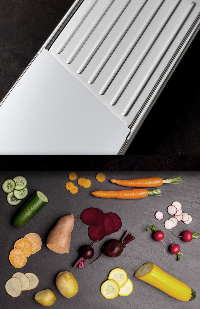 Mit dem Hobel Gurken, Radieschen, Zucchinis, Kartoffeln, Zwiebeln, Äpfel, Salami und viele andere Lebensmittel präzise in gleichmäßige, dünne Scheiben schneiden. Die Hobelklinge ist ideal, wenn Sie Lebensmittel schnell und präzise in dünne Scheiben schneiden möchten. Kreieren Sie gesunde Gemüsesalate wie einen erfrischenden Gurkensalat oder belegen Sie Ihren Salat mit Radieschenscheiben, um eine leicht würzige Geschmacksnote zu erhalten. Hobeln Sie Kartoffeln und verschiedene Gemüsesorten für schöne Gratins. Cocktailgarnierungen, aromatisches Wasser oder Nachtische, verfeinern Sie diese mit Scheiben von Orangen, Zitronen, Gurken, oder Ingwer.
